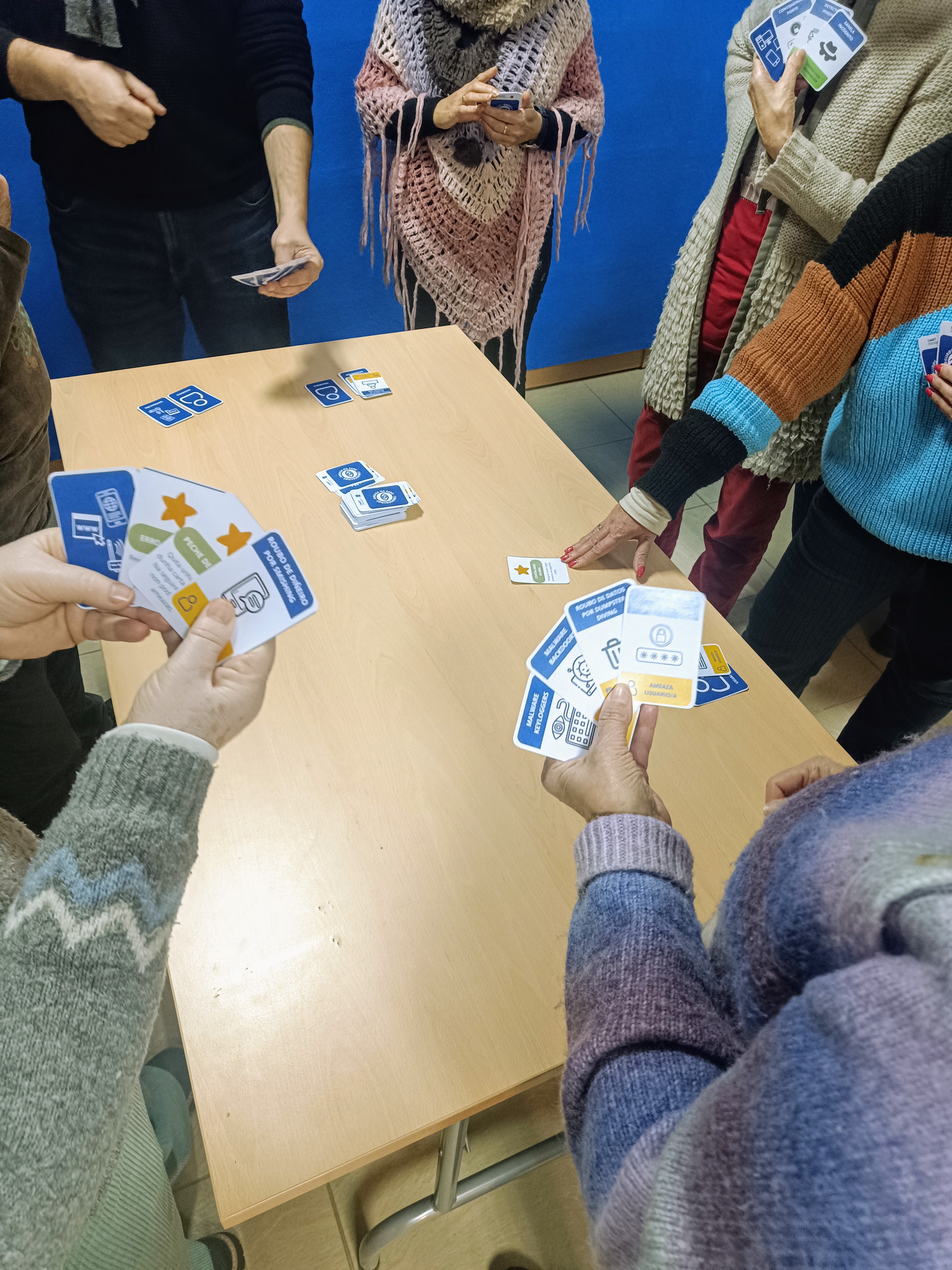Uno de los elementos innovadores de este taller fue el juego de cartas Cibersegur@s: amenaza en la red, diseñado para que las personas participantes pudieran poner en práctica los conceptos aprendidos de forma interactiva. Cada carta representa un riesgo o amenaza digital, y la dinámica permitió analizar, discutir y aplicar medidas preventivas para proteger la información personal y la identidad digital. Esta metodología convierte el aprendizaje en una experiencia participativa, reforzando la formación y haciendo que la protección de datos sea comprensible y aplicable en el día a día.