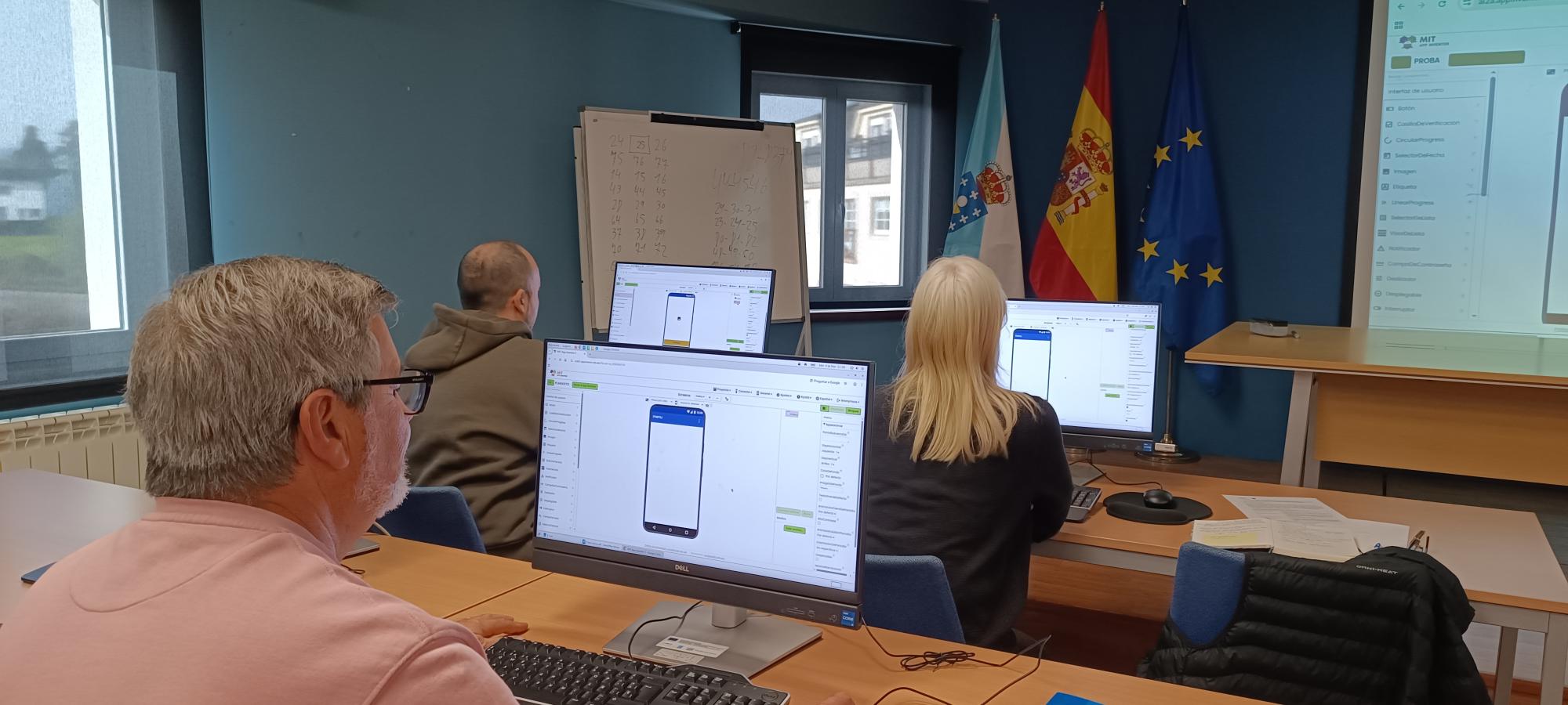 Na segunda sesión, o grupo deu o salto á práctica coa ferramenta MIT App Inventor, coñecendo a súa interface e desenvolvendo paso a paso unha aplicación móbil sinxela que integraba os datos seleccionados. As persoas participantes deseñaron a interface, programaron a lóxica básica da aplicación mediante bloques visuais e probaron o resultado final nos seus dispositivos.