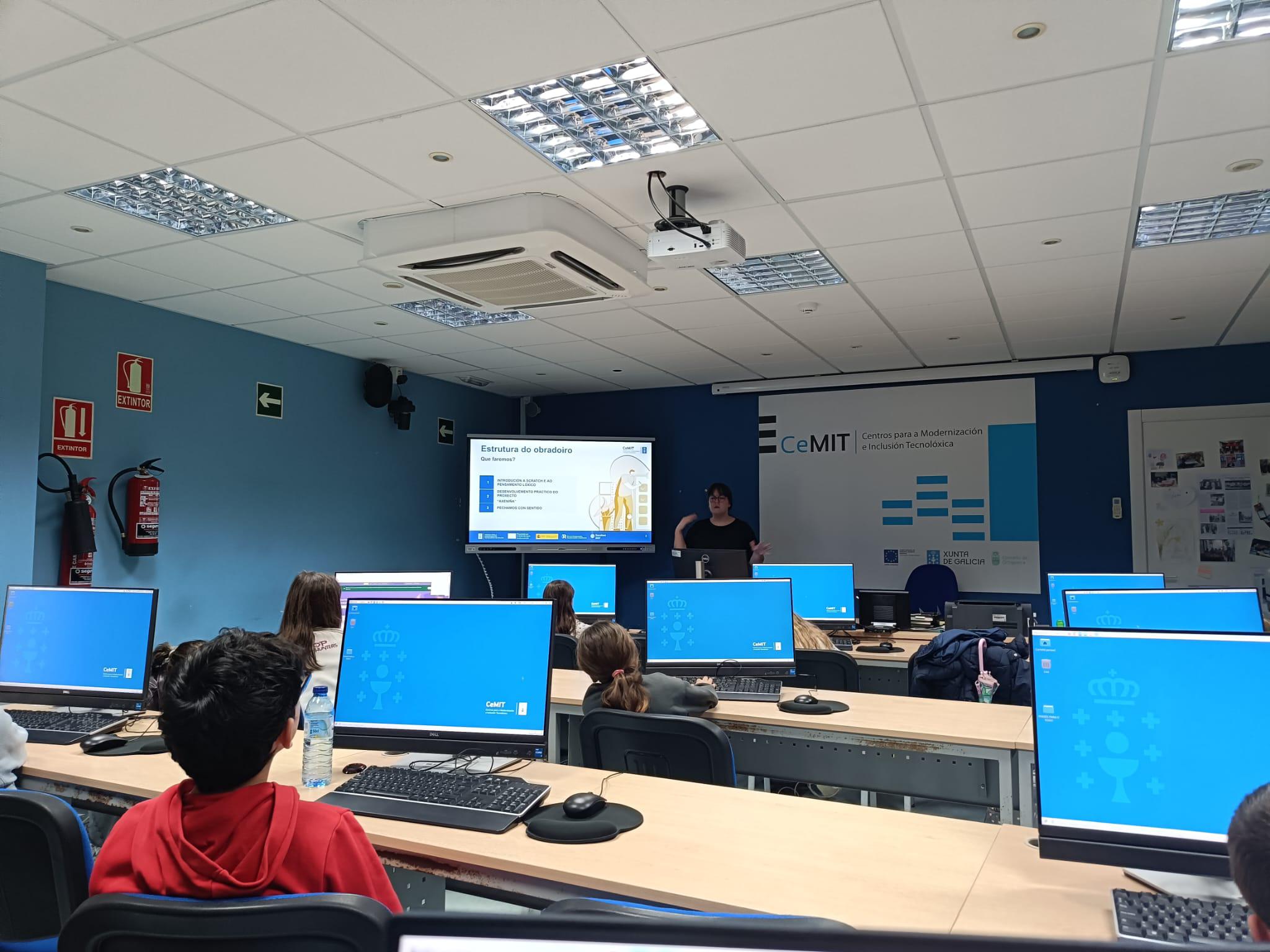 Durante a sesión, os nenos e as nenas participantes achegáronse aos fundamentos da programación visual, coñecendo o funcionamento da contorna de Scratch, os bloques de control e as estruturas lóxicas básicas. Ao mesmo tempo, traballouse a importancia de visibilizar referentes femininos no ámbito científico, tecnolóxico e social, poñendo en valor as súas achegas ao longo da historia.
